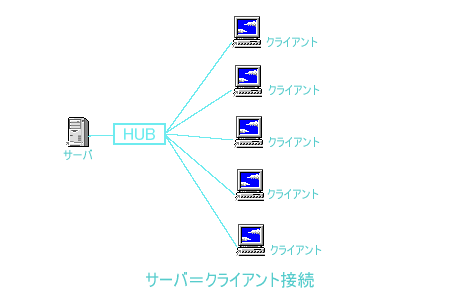 コンピュータ同士のつなぎ方ですが、基本的にコンピュータ同士を“数珠のように”バス 接続していく方法をピアトゥピア(Peer to Peer)といいます。例えば何人かの人が手を つないで横に1列に並んだイメージです。これは主に少ない台数のPC向けです。一方、 一台の管理用PCを決めて、これに他のPCが放射状に接続されてる状況をサーバ= クライアント接続といいます。これのいいところはLAN管理を1台のサーバで行えるため 管理が簡単なことと、それぞれのPCのアクセス許認可(セキュリティといいます)の点で 合理的なことです。 |